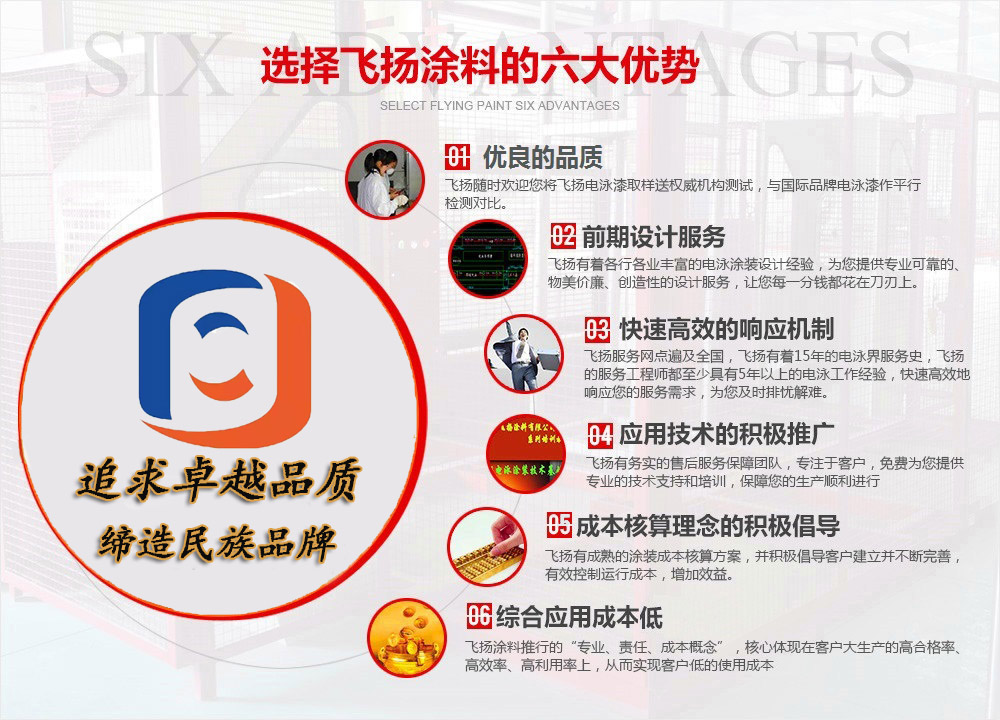 飛揚(yáng)涂料創(chuàng)立于1999年,是專注于陰極環(huán)氧電泳漆研發(fā)、生產(chǎn)、銷售和服務(wù)的電泳漆生產(chǎn)廠家,公司已通過(guò)IATF16949國(guó)際質(zhì)量管理體系認(rèn)證。“提供適合客戶的產(chǎn)品,助力客戶提高產(chǎn)品品質(zhì)、降低運(yùn)行成本、增加效益”是飛揚(yáng)立足業(yè)界的根本!...